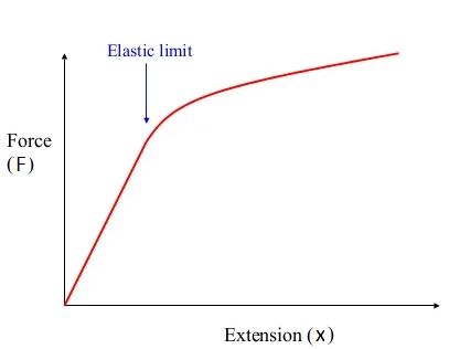 - After crossing the elastic limit, the graph curves and no longer shows a straight line. In this region, the extension increases more rapidly for the applied force, indicating plastic deformation.