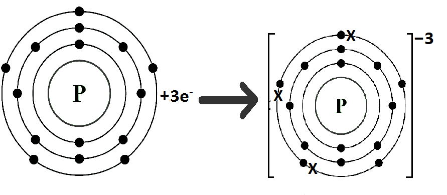 Phosphorus belong to Group VA. It has five electrons in valence shell. It gains three electrons to complete octet.