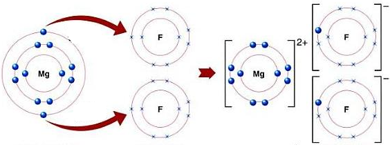 Mg is metal and F is non-metal. Mg atom has two electrons in its outermost shell. It loses two electrons to form Mg+2 ion. Since F atom has seven electrons in outermost shell, so it gains one electron to form F– ion.