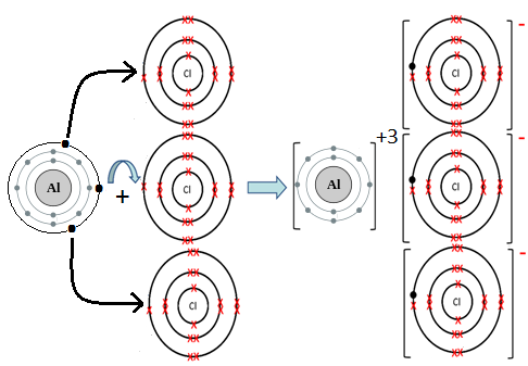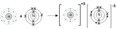 Al atom has three electrons In outermost shell. It loses three electrons to form Al+3 ion. Since, N atom has five electrons in outermost shell, so it gains three electrons to form N-3 ion. For every Al+3 ion we need N-3 ion.