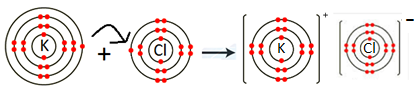 Metal atom tends to lose electrons and non-metal atoms tends to gain electrons to acquire electronic configuration of nearest noble gas. Since K atom has one electron in the outermost shell. It losses one electron to form K+ ion. Since Cl– has seven electrons in outermost shell, it needs one electron to complete octet. So it gains one electron to form Cl– ion. For every K+ ion, we need one Cl– ion.
