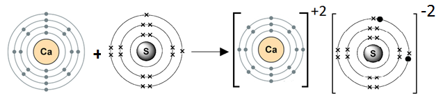 Ca is metal and S is non-metal. Ca atom has two electrons in outermost shell. It loses two electrons to form Ca+2 ion. Since S atom has six electrons in outermost shell, so it gains two electrons to complete its octet and form S-2 ion.