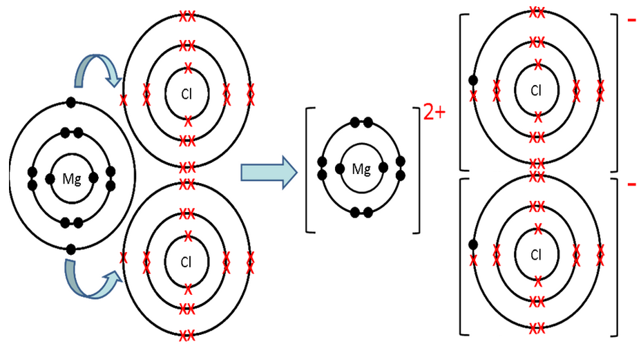 Mg is metal and Cl is non-metal. Mg atom has two electrons in its outermost shell. it loses two electrons to form Mg+2 ion, Since Cl atom has seven electrons in outermost shell, so it gains one electron to form Cl– ion. For every one Mg+2 ion, we will need 2 Cl– ions.