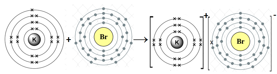 K is metal and Br is non-metal. Metal atom tends to lose electrons and non-metal atoms tends to gain electrons to acquire electronic configuration of nearest noble gas. Since K atom has one electron in the outermost shell. It losses one electron to form K+ ion. Since Br– has seven electrons in outermost shell, it needs one electron to complete octet. So it gains one electron to form Br– ion. For every K+ ion, we need one Br– ion.