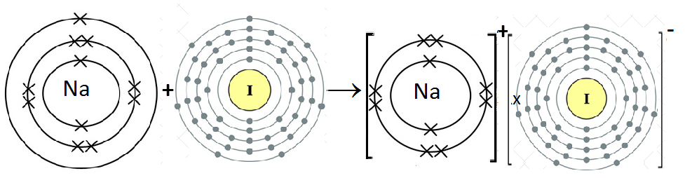 Na is metal and I is non-metal. Metal atom tends to lose electrons and non-metal atoms tends to gain electrons to acquire electronic configuration of nearest noble gas. Since Na atom has one electron in the outermost shell. It losses one electron to form Na+ ion. Since I– has seven electrons in outermost shell, it needs one electron to complete octet. So it gains one electron to form I– ion. For every Na+ ion, we need one I– ion.