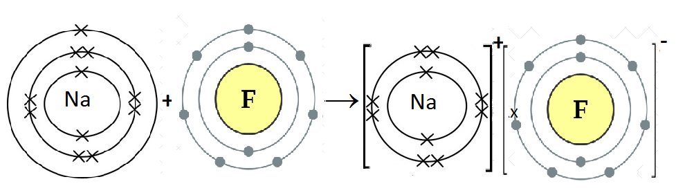 Since Na is metal and F is non-metal. Metal atoms tends to lose electrons and non-metal atoms tends to gain electrons to acquire electronic configuration of nearest noble gas. Na atom has one electron in the outer most shell. It losses one electron to form Na+ ion. F atom has seven electrons in outermost shell, it needs one electron to complete octet. So it gains one electron to form F– ion. For every Na+ ion, we need one F– ion.